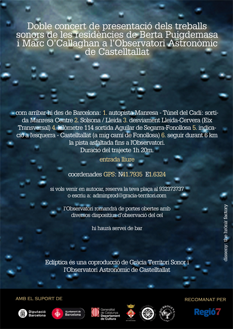 The artista¡ residency program Eclíptica has been activated for the fifth consecutive year. As in previous years two sound artists will complete a residency program at the Observatori Astronòmic de Castelltallat (Castelltallat Astronomical Observatory). During 7 days and 7 nights the artists will explore the skies and the territory of the Castelltallat ridge with the two coordinators of the residency: Toni Guntín and Jordi Girbén. The sonic result of their work will be shared in a public concert on the night of the 20th of July at the Observatory. Marc O’Callahan (Coàgul) is currently completing his residency program. The following will be Berta Puigdemasa. Both are Gràcia Territori Sonor’s resident artists for 2013.